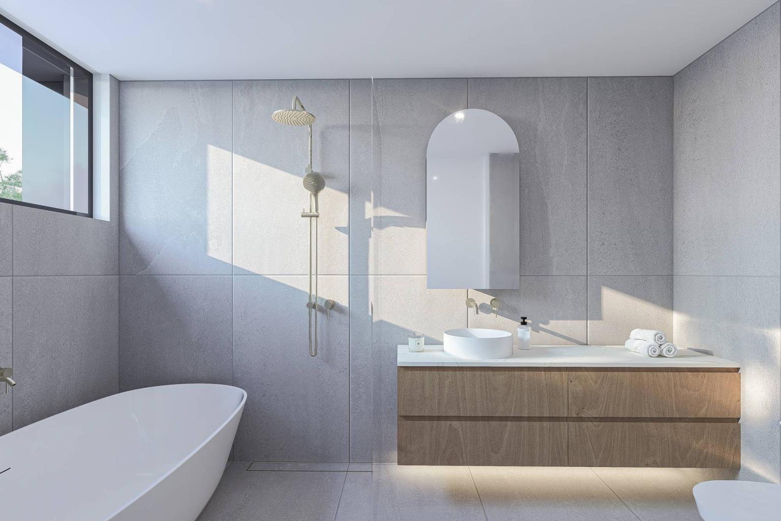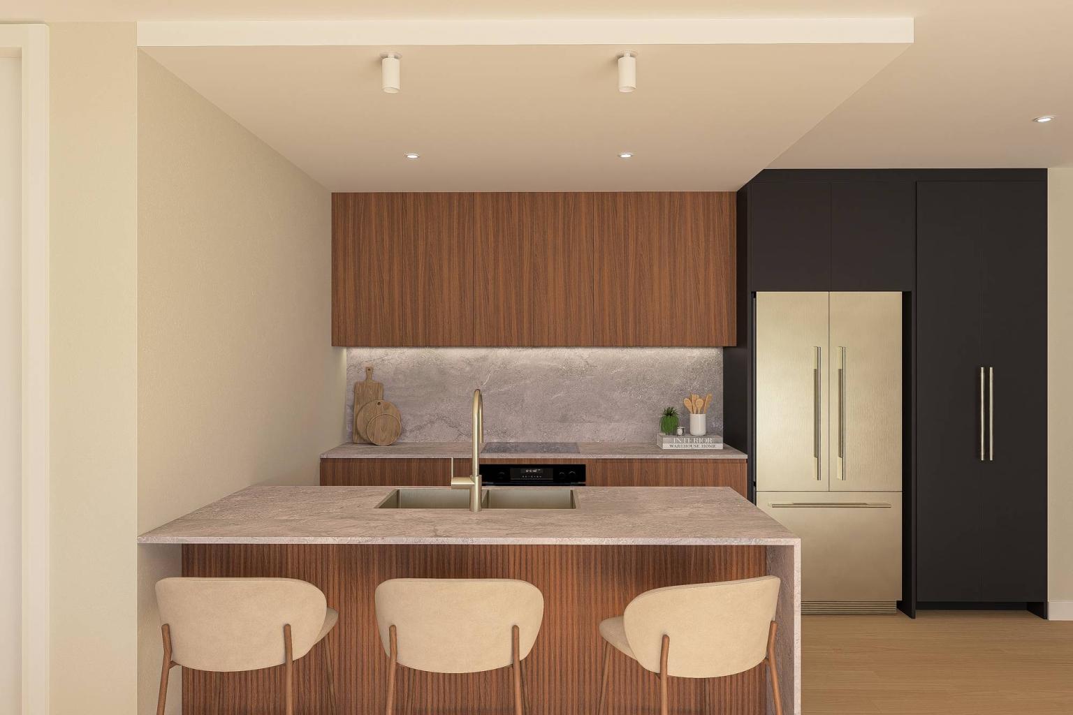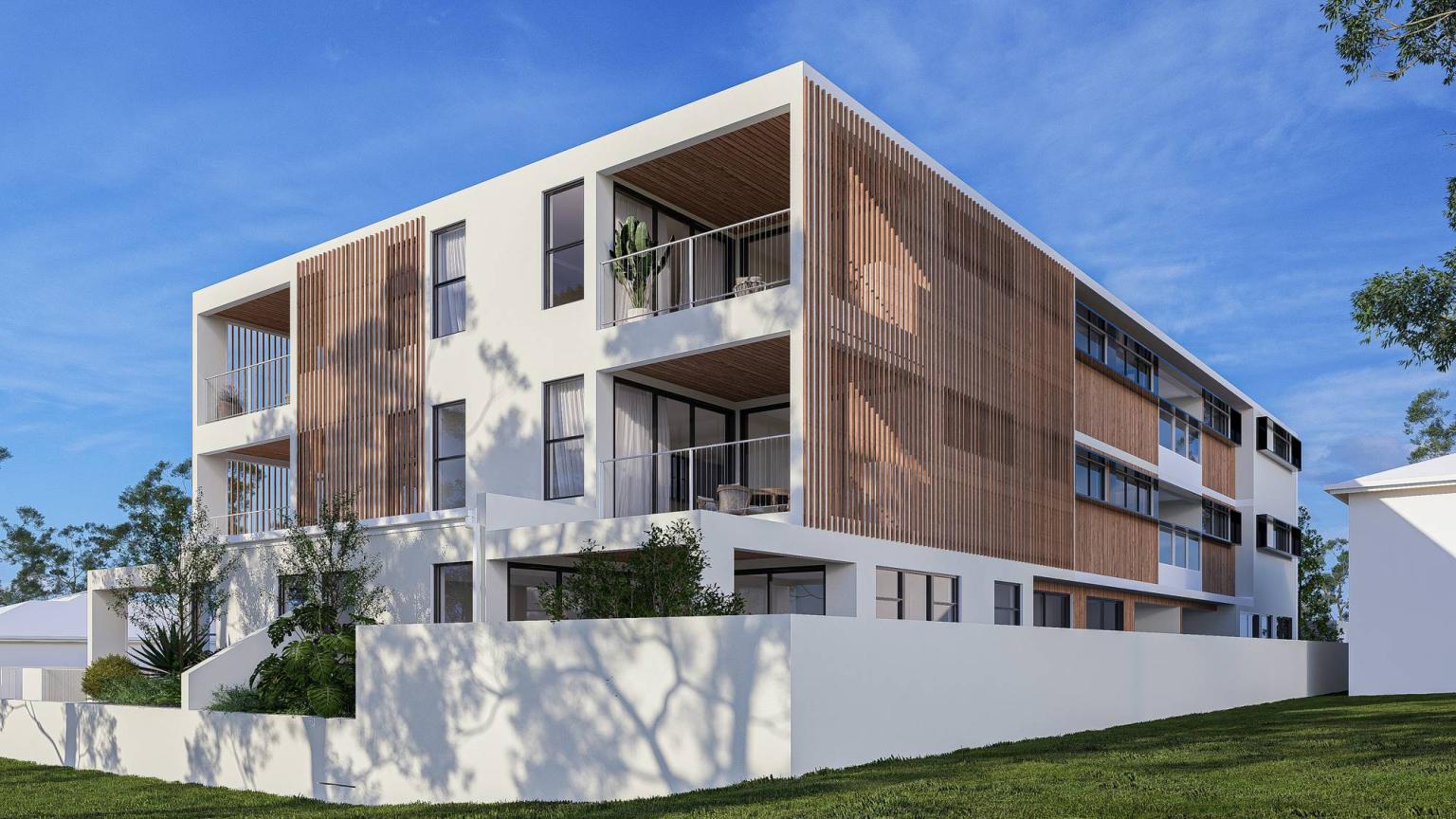 Altitude features a clean, modern aesthetic with a strong mix of white surfaces and warm timber accents. Vertical battens create a soft, rhythmic texture across the façade, while large balconies and full-height windows make the design feel open and light. Greenery is woven throughout the building, from planted balconies to a lush rooftop terrace, giving the architecture a fresh and natural feel. The overall design is contemporary, balanced, and welcoming, with simple forms brought to life through thoughtful materials and landscaping.